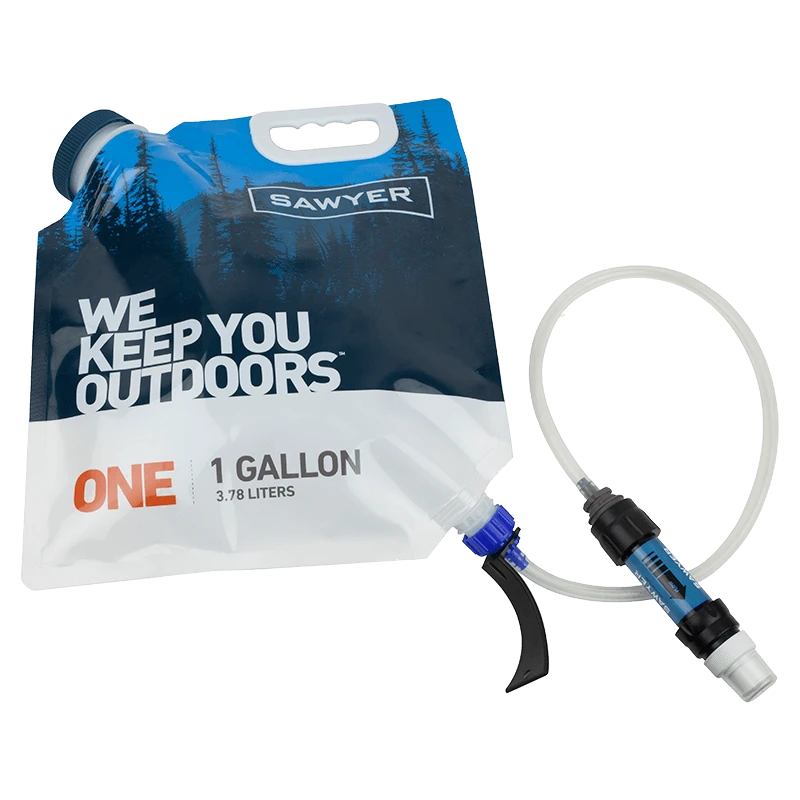 Sawyer Mini 1-Gallon (3.78 L) Gravity Filtration System A lightweight, robust solution for filtering large quantities of water in as little as 7 minutes, Sawyer’s 1-Gallon Gravity System paired with the included dual-threaded MINI filter is ideal for backpacking, backcountry camping, and emergency preparedness. With threads on both sides, you can screw the push/pull cap onto the MINI for easy on/off functionality while filtering to control water flow. Features 0.1 Micron Absolute Filtration Removes 99.99999% of all bacteria, such as salmonella, cholera and E.coli, and removes 99.9999% of all protozoa (such as giardia and cryptosporidium). Tiny ‘U’ shaped hollow fiber micro-tubes that trap contaminants while allowing decontaminated water to freely pass through at a high flow rate Dual-threaded Mini Filter Impossible for harmful bacteria (like salmonella), protozoa, or cysts like E. coli, Giardia, Vibrio cholera, and Salmonella typhi to pass through the filter. Exceeds US Environmental Protection Agency (EPA) recommended removal rates Gravity Does the Work Unscrew the wide mouth opening and fill the bag with water from any source — lake, stream, faucet, etc. — and connect the included tube between the bladder and the Mini. After filling, hang the reservoir with the MINI below it from a tree, the back of your pack, or simply hold it up with your hand. Water will flow through the MINI to produce fresh, clean water for drinking and cooking. 100,000 Gallons (378,541 Litres) The Mini can be cleaned and reused almost indefinitely with no expensive cartridges to replace… ever. Sawyer recommends backwashing and sanitizing the filter after every outing for optimized use. Maximum Versatility Ideal for outdoor recreation, hiking, camping, scouting, domestic and international travel, and emergency preparedness Specifications Includes: 1x New Dual Threaded Sawyer Mini Filter, 1x One Gallon Gravity Bladder, 1x Cleaning Plunger, 1x Cleaning Coupling, 1x 1/4″ Inner Diameter Tubing, 1x Tube Protector Longevity: up to 100,000 Gallons (378,541 Litres) Volume: 3.78L (1 Gallon) Filter Material: 0.1 Micron Absolute Hollow Fiber Membrane Removes: Bacteria, Protozoa, and Cysts Total Weight: 250g (SP160)