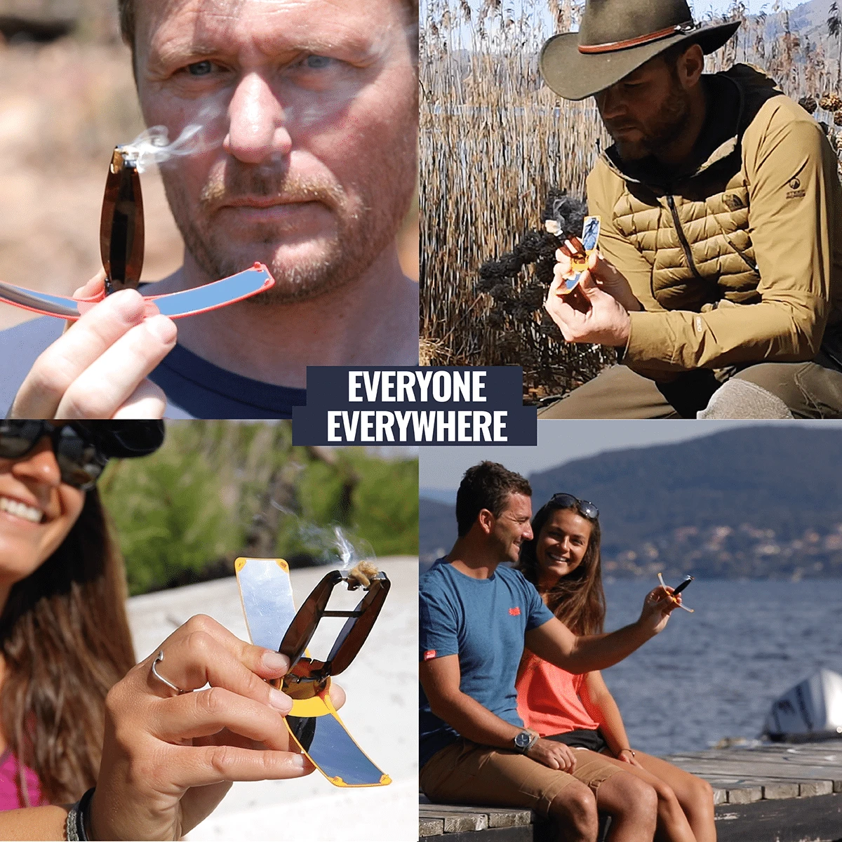 The high performance Suncase Solar Lighter spreads its wings and concentrates the sun’s rays in a focal point for ignition in 3 seconds. It will quickly and easily ignite wood, paper, tobacco, incense + more. Its case protects the specialized mirrors and opens to easily ignite a fire or bbq. It’s ultralight and compact and slips into a pocket to be taken anywhere. Waterproof & windproof, the SUNCASE is ideal for camping and survival. Ultra Light & Compact Wind and Waterproof Works even in cold conditions Easy to light Extendable clamp for different ignition materials Suitable for all types of solid fuel: Wood, paper A standard BIC mini style lighter can be inserted for a complete day/night solution Strong, durable mirrors designed for outdoor use Made from 70% recycled material How it works: The Solar Lighter uses highly reflective parabolic mirrors which allows high temperatures (up to 400° C) to be reached instantly by concentrating the sun’s rays in a focal point. Place your fuel into the clamps and direct the sun’s rays to start ignition. Specifications: Weight: 12g Dimensions: 3 x 7 x 2 cm Materials: Recycled ABS, Recycled Polycarbonate, S-ReflecT © Mirror Made in France (SC_P)
