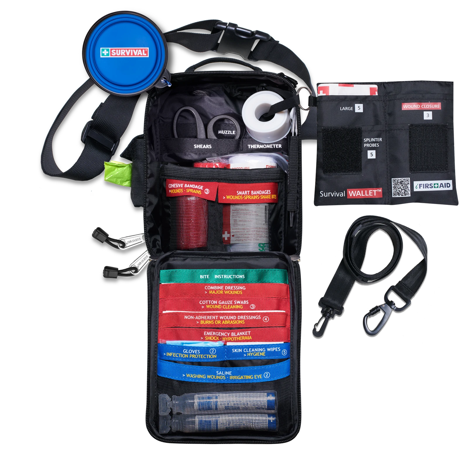 Survival Premium Pet First Aid Kit If you’ve got four-legged friends in your family, or know that certain someone who loves Fido more than life itself, SURVIVAL’s radical new Pet First Aid KIT is the must-have pet product for everyday and emergency use. Expertly designed to sit perfectly on your hip with a clever waist belt attachment, this pet powerhouse provides easy access to every accessory, treat and first aid tool your favourite furry friend will ever need. Never again will you need to search through your belongings for a pet poo bag — swiftly dispose of your doggy doo-doo, with eco-friendly disposal bags located in an easily accessible exterior pocket. And a zippered pouch for treats means you can reward your favourite fur balls quickly and easily, while keeping all canine goodies safe and secure whenever you’re on the go. Perfect for the home, car or daily ‘walkies’ adventures, this ground-breaking Pet First Aid KIT features everything you need to keep your beloved furry friends satisfied and safe – and their humans, too! What’s Inside the Kit: 2x 30ml Saline Cohesive Bandage 5cm x 2m Cohesive Bandage 7.5cm x 2m Cohesive Bandage 10cm x 2m Combine Dressing 20cm x 10cm 3x Cotton gauze swabs Digital Thermometer Eco-friendly poop bag roll Emergency Foil Blanket Hypo allergenic tape 2x Nitrile gloves (pair) 2x Non Adherent Wound Dressing 5cm x 5cm 2x Non Adherent Wound Dressing 7.5cm x 7.5cm Shears Collapsible Mini Silicon Pet Water/Food Bowl 5x Skin cleaning wipes with cetrimide SMART Snake Bandage (pressure bandage) Snake & Funnel-web bite instruction card Survival Wallet Includes: 50x Adhesive Dressings 3x Wound Closures 5x Splinter Probes Tick Removal Spoon Tweezers Features: Easy Access Poop Bag Side Pocket Quick Release Clip gives access to a labelled “Personal” Pocket – Perfect Size for your phone or wallet Easy Carry Handle or use the Adjustable Strap as a Shoulder Bag or Waist Bag Ideal for Camping Trips, Dog Events, Dog Trainers, Doggy Day Cares or Everyday walks with your pet Highlights: Conforming Pet Bandages including SURVIVAL’s SMART Bandage – The key tool to effectively manage potentially deadly snake and Funnel-web spider bites on pets and humans. A snake bite instruction card is also included in this KIT. Digital Thermometer – Monitor the temperature of your four-legged friends to ensure they don’t overheat. Muzzle Pocket – A pocket in the KIT to keep a collapsible muzzle. Please note that a muzzle is not included in this KIT. Silicon Pet Bowl – Give your pet food or water no matter where you are. Tick Removal Spoon & Tweezers – Specifically designed to remove a tick that has attached itself to the body. Shears – Clip away any nasties. Waist & Shoulder Straps – Swap from waist belt attachment to carry securely on your shoulder, making it portable and easily accessible for walks or hikes. PLUS, the Shoulder Strap doubles as a dog lead! Vital first aid supplies – Including dressings, swabs, emergency foil blanket and skin cleaning wipes can be used to treat animals and humans alike. Specifications: Dimensions (When Closed): 19cm x 16.5cm x 10cm Weight: 1.05kg (6002476)