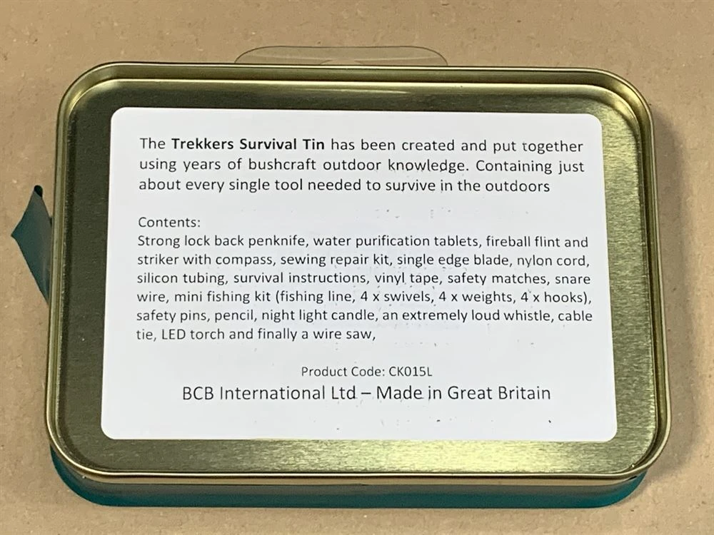 Trekkers Bush Survival Kit The Trekkers Bush Survival Kit has been created and put together using years of bushcraft outdoor knowledge. Containing just about every single tool needed to survive in the outdoors. The kit is supplied in a weatherproof metal tin. Ideal for unexpected survival situations but it also makes a great gift. Contents: – Strong self-locking Penknife – Water Purification Tablets – Fire Starter Flint – Flint Striker with Compass – Sewing Repair Kit – Single Edge Blade – Nylon Cord – Silicon Tubing – Survival instructions – Vinyl Tape – Safety Matches – Gold Wire Animal Snare 3.5 metres (12ft) – Mini Fishing Kit (fishing line, 4 x swivels, 4 x weights, 4 x hooks) – Safety Pins – Cable Tie – Accident Evaluation Form – Pencil – Button sized Compass – LED torch – Night Light Candle – An extremely loud Whistle – Wire Bush Saw All packed into it’s own weatherproof metal tin. Specifications: Dimensions: 122mm x 87mm x 36mm Weight: 209g Made in Great Britain (CK015L)