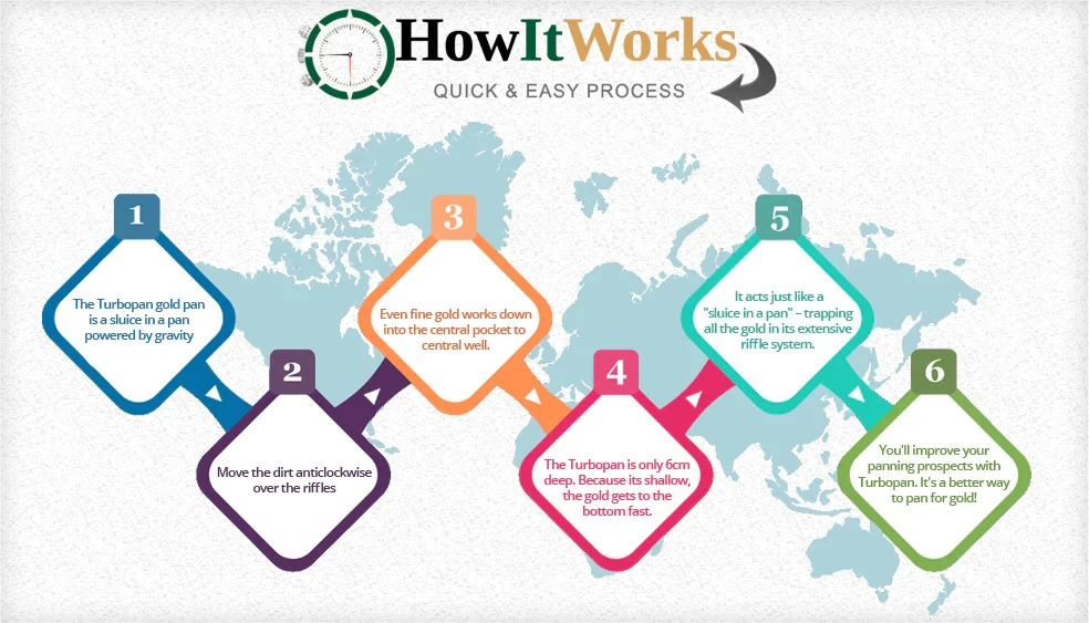 TurboPan Gold Pan 40cm Green Turbopan is just like a sluice – in a pan. The sluice riffles don’t just trap the gold in protected zones, they funnel the gold into the central deep pocket. With the riffled bottom, it’s good bye to compaction plus, because Turbopan is wide and shallow, the very heavy gold sinks quickly to the bottom to be trapped. Just use Turbopan like you would normally pan and discover how much more gold you keep. Check the fines with a 10x hand lens to see the 10 micron gold Turbopan catches. Features: Green – Strong Contrast for Gold, cassiterite, azurite and black sands. It’s easier to pan away the black sands when you can see them. Designed & Manufactured in Australia Concentrates Gold in the deep Pocket in the Center of the Pan Sluice in a Pan – riffles funnel gold to the Center of the Pan then become trapped Simple & Easy to Use Specifications: Dimensions: 40cm (Dia.) x 5.5cm Colour: Green Weight: 350g (8930614GRN)