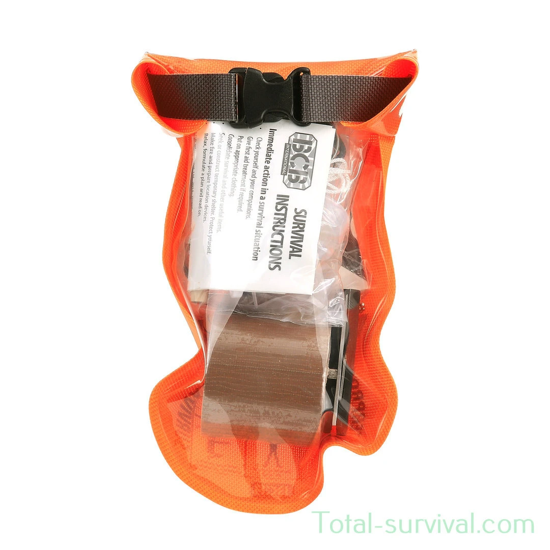 Waterproof Survival Kit A new waterproof roll-sealable pouch containing a high-quality survival kit packed in a Waterproof bag. Features What’s inside: Matches Mini folding knife Button compass Water purification tablets x 10 Dry bag Micro torch Signalling mirror Duct tape Accident evaluation form Razor blades Nylon cord Nightlight Pencil sewing kit Gold wire (12 ft) Fishing kit Wire saw Distress whistle Fireball flint & striker Survival instructions Safety pins x 6 Lightweight Watertight seal Belt attachment Drawstring cord to loop over your neck Specifications Contents: matches, mini folding knife, button compass, water purification tablets x 10, dry bag, micro torch, signalling mirror, duct tape, accident evaluation form, razor blades, nylon cord, nightlight, pencil sewing kit, gold wire (12 ft), fishing kit, wire saw, distress whistle, fireball flint & striker, survival instructions, safety pins x 6 Size: 12 x 19.5cm Weight: 198g (CK050)